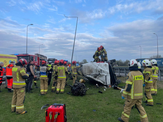 PODKARPACIE: Dachowanie busa na A4. Dwie osoby trafiły do szpitala [ZDJĘCIA]